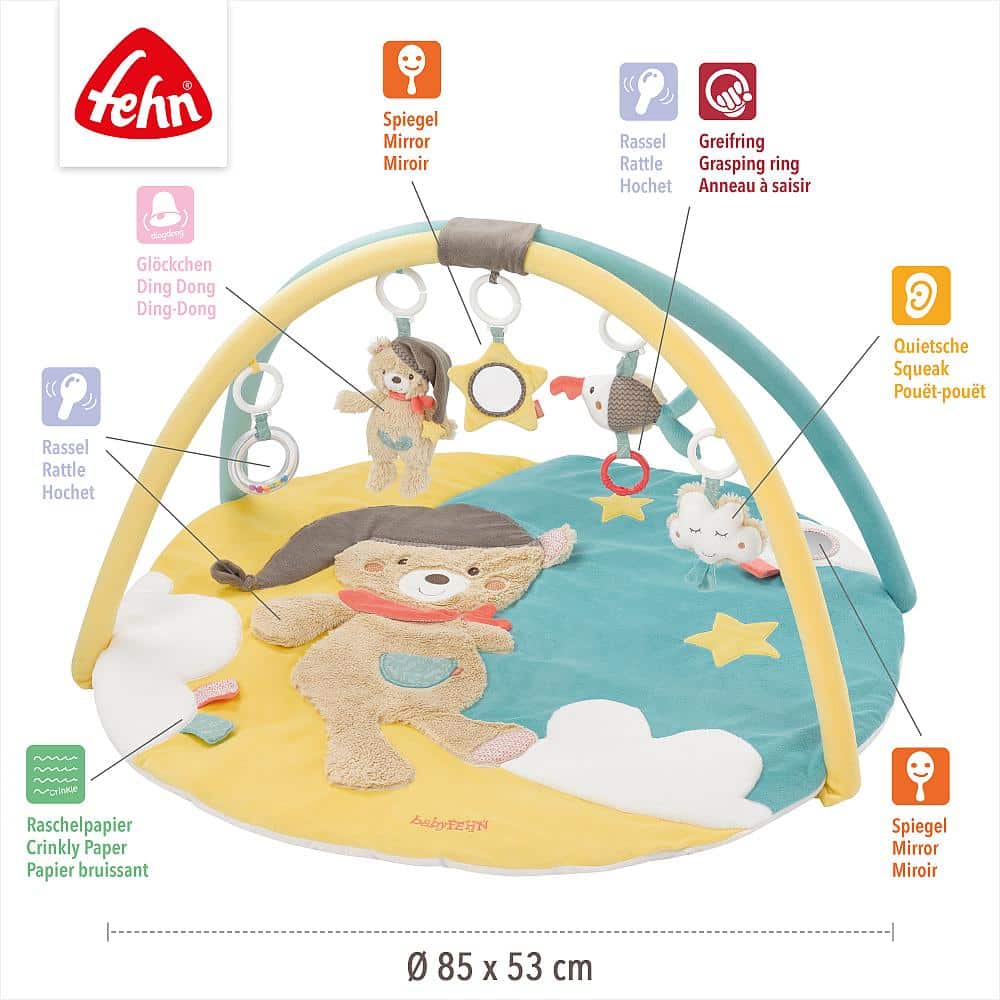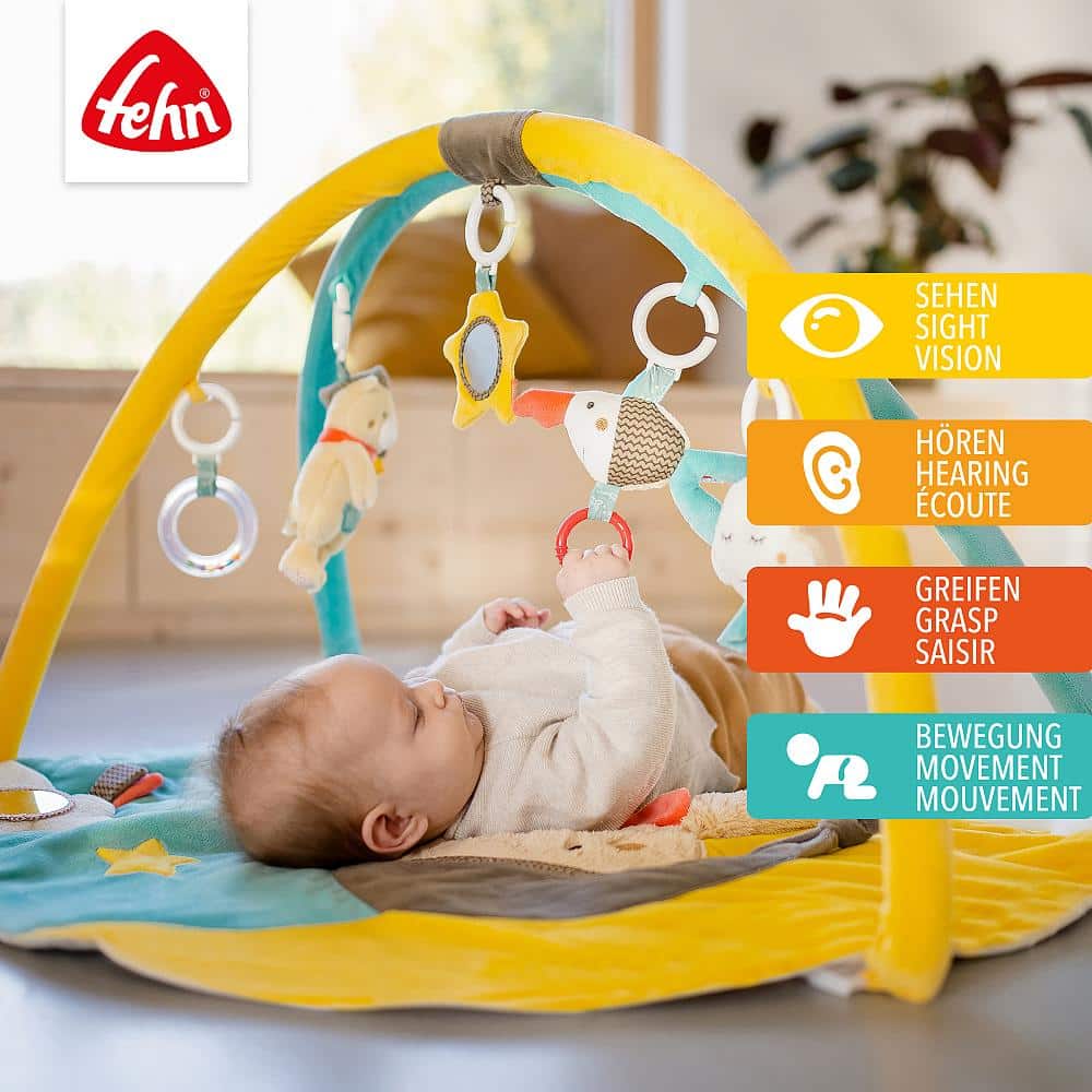 Kërcitja e fshehur, kërcitja, pasqyra, zhurma dhe dingdong promovojnë aftësitë motorike dhe krijojnë kuriozitet ndërsa kapeni, përqafoni dhe luani