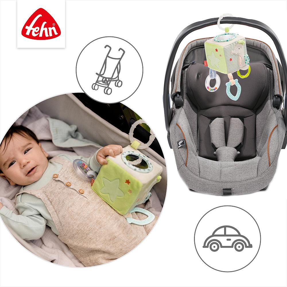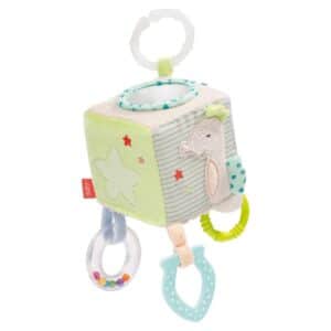 Duke luajtur argëtim në shtëpi dhe në lëvizje: falë unazës praktike C, kubi i aktivitetit mund të ngjitet lehtësisht në karrocë fëmijësh, karrocë për fëmijë ose krevat fëmijësh